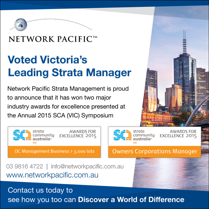 Network Pacific Strata Management is proud to announce that it has won two major industry awards for excellence presented at the Annual 2015 SCA (VIC) Symposium.